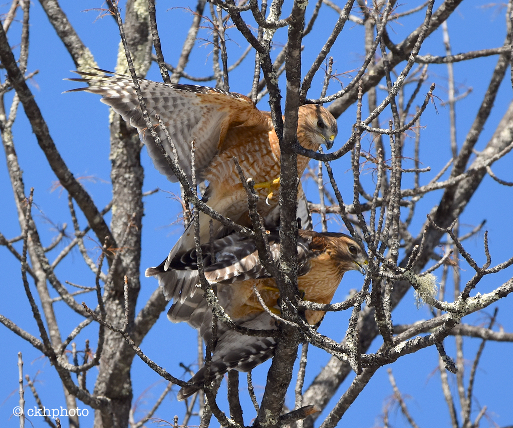 A pair of Red-shouldered Hawks exhibit a “Probable” Breeding Code, in this case “C – Courtship, Display or Copulation.” © Craig Hunt