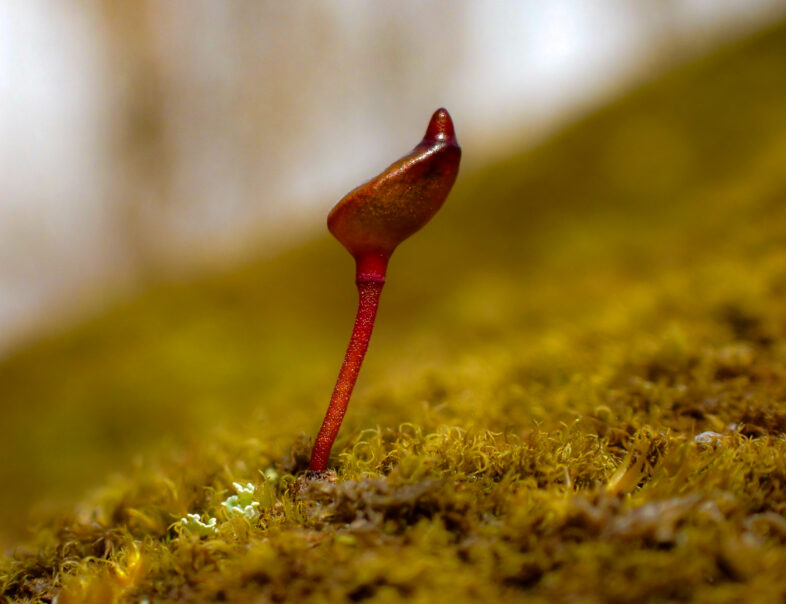 Bug-on-a-stick is not actually a bug on a stick, but a unique-looking moss (Buxbaumia aphylla) found in temperate regions across the world. Named for its tiny fungus-like stalk and capsule that resembles a bug perched on the end of a stick, this moss is a pioneer species that likes disturbed soil with minimal competition from other plants. After the snow melts in the spring, green stalks and capsules begin to appear, turning coppery red as they mature. With any luck, you might find these elusive mosses in the forest growing from the decaying wood of old logs or along the edges of creeks.