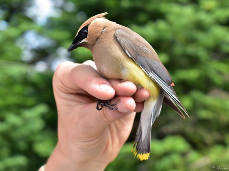 A sleek adult female Cedar Waxwing, a species seldom captured in VCE’s mist nets on Mt. Mansfield. / © Nate Launer