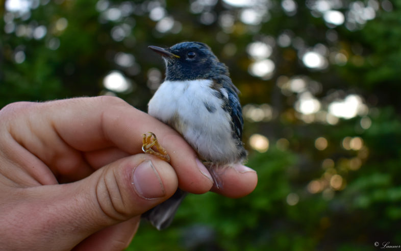Male Black-throated Blue Warbler, the most common non-local species among VCE’s mist net captures in late summer and autumn. / © Nate Launer