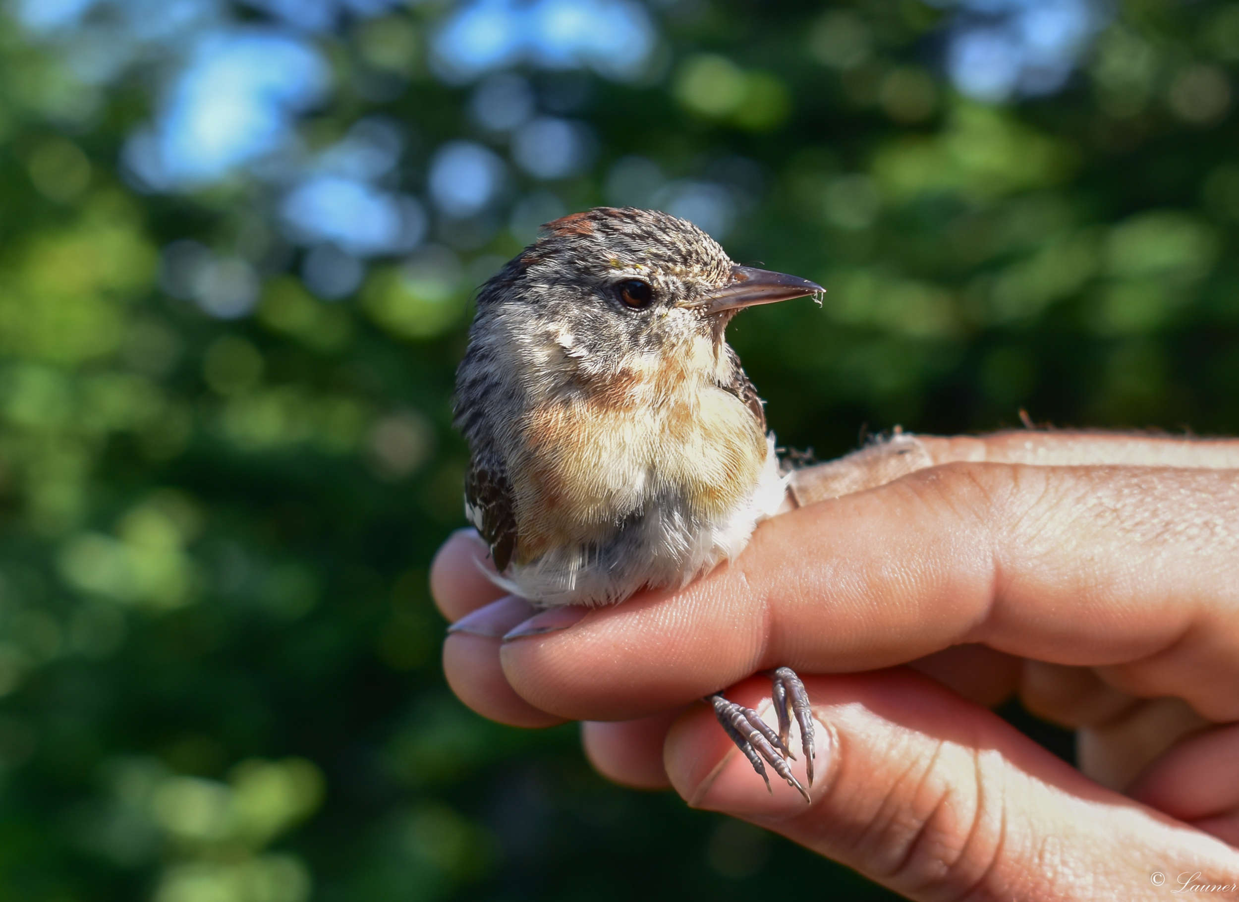 A mist-netted adult female Bay-breasted Warbler, very unusual on Mt. Mansfield in summer and likely a failed or early-dispersing breeder. / © Nate Launer