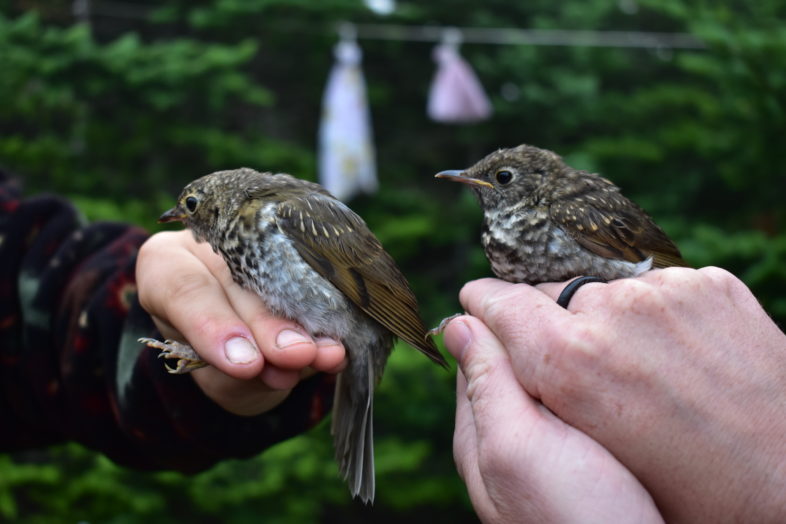 Juvenile Swainson’s Thrush (left) and Bicknell’s Thrush (right) – a challenging identification! / © Nate Launer