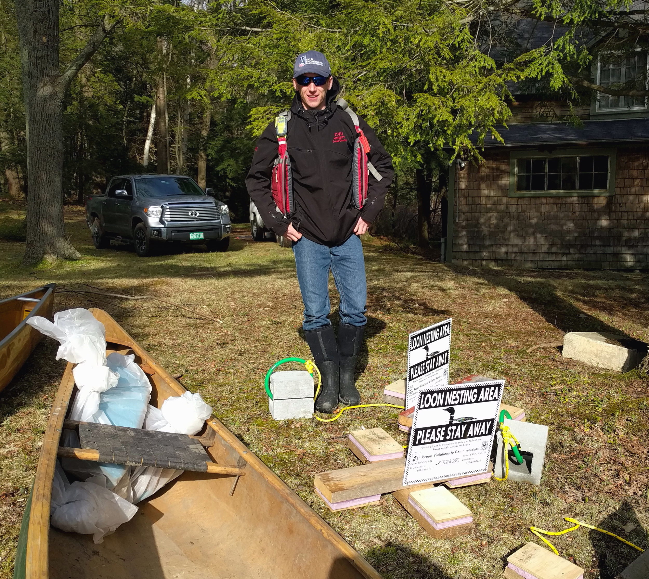 Caleb and VCE loon biologist, Eric Hanson, transport vegetation to the upgraded raft and set out new loon nest warning signs. © Will Nye
