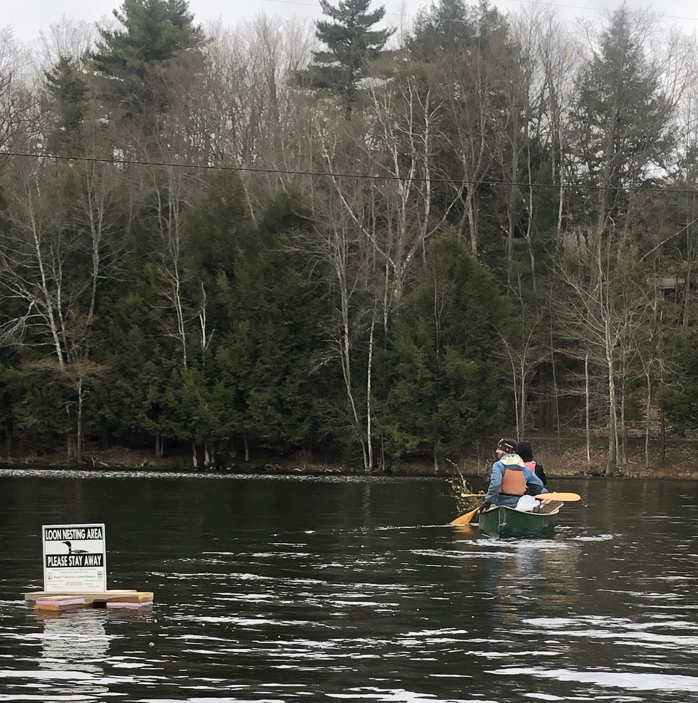 Caleb instructed and guided his fellow scouts on building new nest warning signs for use on Lake Iriquois, and replaced the mesh on the existing loon nesting raft with heavy-duty metal lobster trap material. The lake’s loons had used the raft successfully in 2019, but muskrats had discovered that the raft made for a good winter feeding and hang-out spot, and had chewed through the plastic mesh. This spring, Caleb assisted me with placing shrubs, small trees, soil, and grasses on the raft to create an enticing island-like nest, which we anchored in a quiet cove. Happily, we were treated by the loon pair swimming up to and around the raft within 30 minutes of us finishing our house-keeping duties! The pair nested by mid-May, and have successfully reared two chicks this summer.