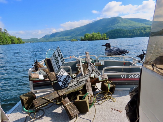 Mike and Rosie Korkuc collect nest warning signs from Lake Dunmore after a successful hatch. © Mike Korkuc