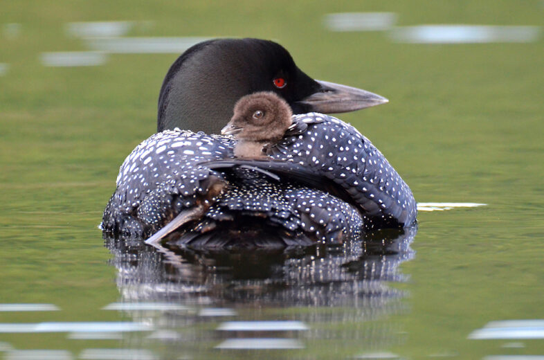 What a way to travel! Just a few days after hatching, a chick is ferried around Bald Hill Pond in the lap–er, back–of luxury (photo taken in summer 2019). This summer’s loon pair on Bald Hill Pond started nesting this past weekend for one of the latest start dates recorded in Vermont. / © Lorna Kane Rohloff