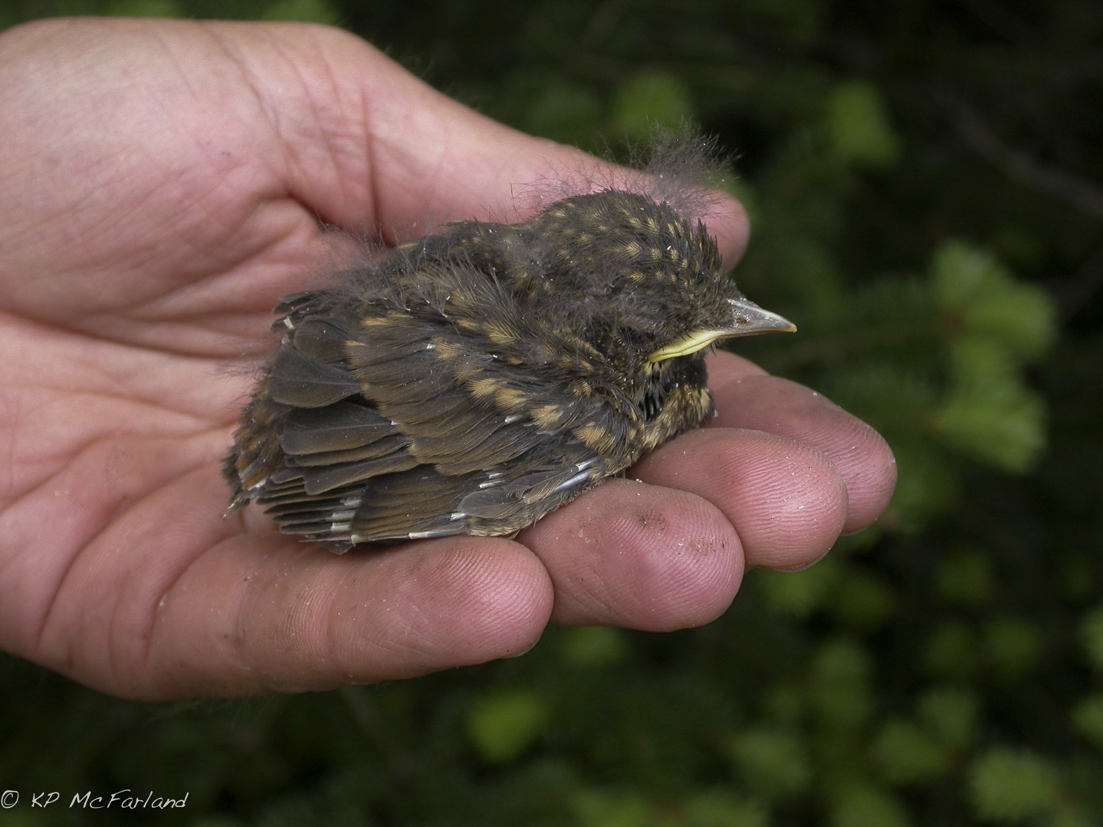 On a hot day in early July 2002, McFarland and biologist Ben Flemer quietly visited a thrush nest that they had been monitoring for several weeks. The chicks were 7 days old. It was time to band them. Each of the four nestlings only sported sparse downy feathers and newly-opened eyes. Together, all four barely covered McFarland’s palm as he handed them to Flemer to band. With a new silver band on each bird, McFarland placed them gently back in the nest. A week later, they had grown enough to leave the nest. Most young birds never make it to their first birthday, but five months later, at least one of these chicks was alive and well in the Sierra de Neiba.