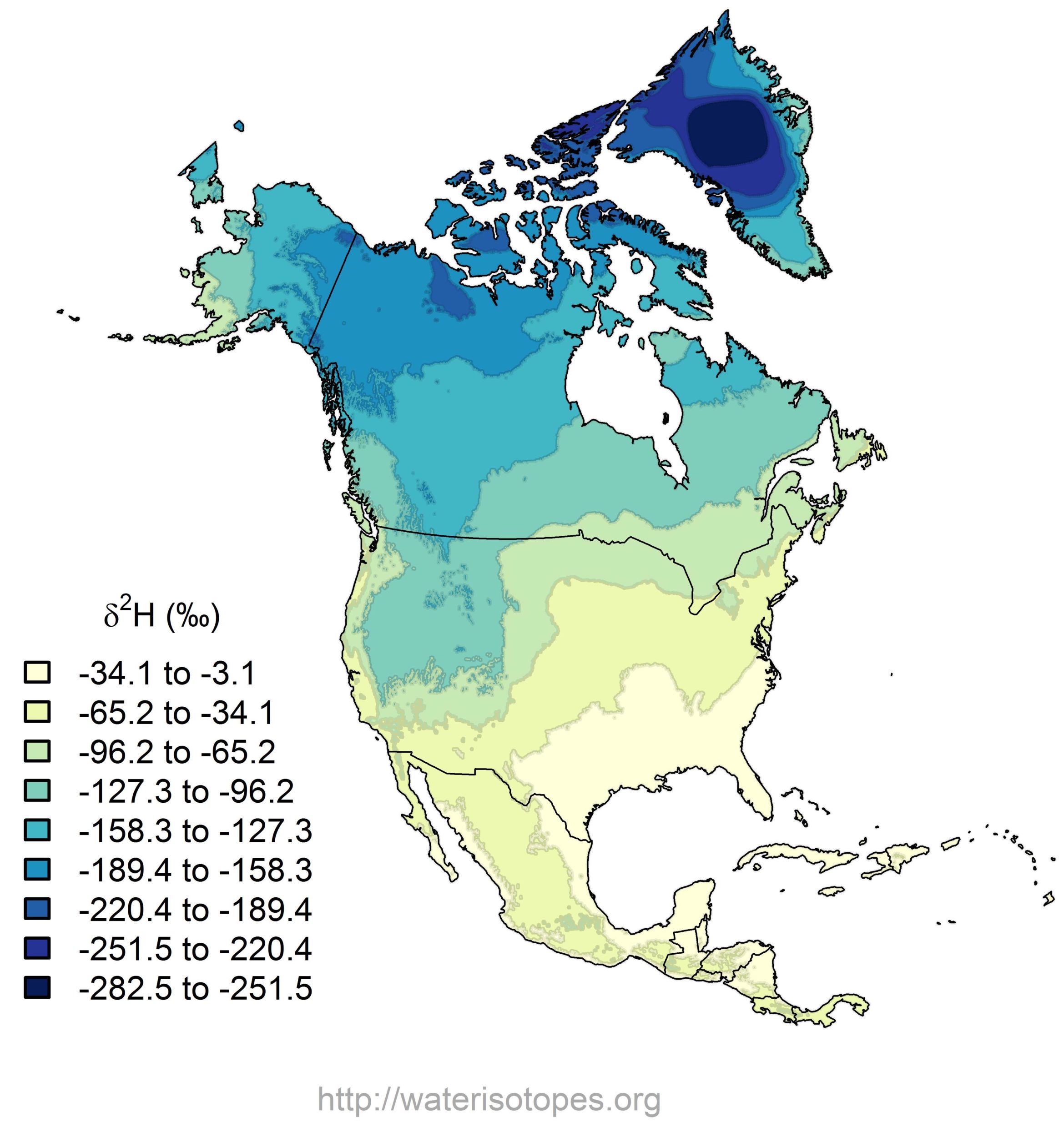 The scientists examined the prevalence of a stable hydrogen isotope in more than 850 Green Darner wings to infer their natal origins. Why hydrogen? The hydrogen nucleus normally contains a single proton. But a tiny fraction of hydrogen atoms carry one proton and one neutron. It’s called deuterium. It turns out that the amount of deuterium in rainwater varies somewhat predictably in North America. You can map it. The ratio of deuterium to hydrogen in water falling as rain or snow changes on a gradient corresponding roughly on a north-south gradient.
