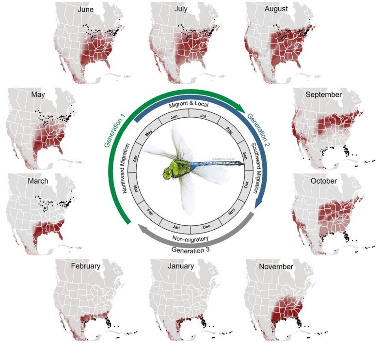 The full annual cycle of the Common Green Darner is comprised of three generations. The first generation is migratory, emerges in the south between February and May and dies in the north. The second generation emerges in the north, migrates south and dies. The third generation, offspring of migratory individuals in the fall, is non-migratory and emerges in the south in November. The emergence origins of adults (color ramp; grey = zero, red = many) captured at the sampling locations (black dots) in each month are shown around the perimeter. Graphic was drawn by Matthew Dodder (https://neornithes.wordpress.com) and used with permission.