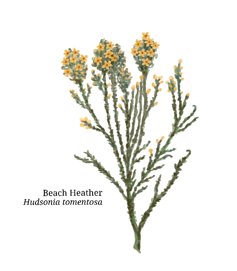 Toward the end of my summer internship, I traveled over to the Champlain Valley with VCE’s Director of Conservation Science, Ryan Rebozo, to study rare plants and do some population monitoring. This included visiting various sites where rare species had been reported in order to remove invasive species and allow more room for the rare species to grow and thrive. One of these sites was near the shore of Lake Champlain, a small sand plain where a humble plant called Beach Heather (Hudsonia tomentosa) grew in patches. This shrub often forms dense mats in sandy environments and is easily identified by its yellow flowers or, if it’s not in bloom, by its scaley, needle-like leaves that help retain moisture. Beach Heather acts as an indicator species to the health of its ecosystem, as well as a stabilizer in sandy soils. Despite its important ecological role, it has now become a rare plant due to increasing development and decreasing sand plain habitat. By removing invasive species from this site (such as cutting back encroaching honeysuckle bushes), measuring tree cover, and taking a rough count of how many individual heather plants are currently present, we are taking a step toward conserving this valuable yet threatened plant.