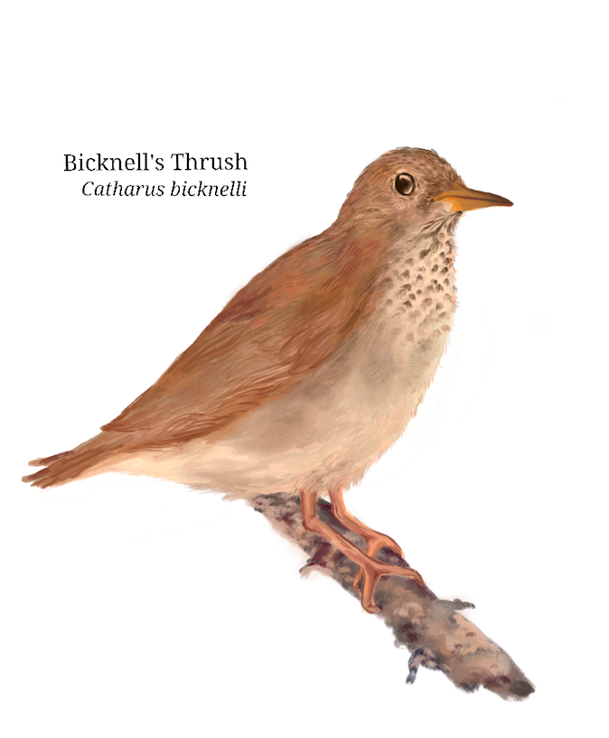 Getting to spend two nights on Mount Mansfield with the 2024 banding team was my favorite internship experience. Before I even got to the mountain, I spent days working in the office alongside paintings of the elusive Bicknell’s Thrush. As I worked, this charming and beloved bird could be seen at every turn, making me even more excited to have the chance to work with them. As climate change and human-driven land change apply pressure to these songbirds’ survival, they need all the support they can get. Given that, imagine my excitement when, after many strenuous net runs, I got to see a young Bicknell’s Thrush and observe it being processed and released first-hand. Although I loved all of the bird species I had the chance to see on Mansfield, especially young Dark-Eyed Juncos, my favorite was undoubtedly the special thrush. I now carry with me fond memories of early mornings and cloudy afternoons assisting with mist netting, seeing banding in action, quickly writing down the banding data, and the palpable excitement in the air whenever a Bicknell’s Thrush was caught.
