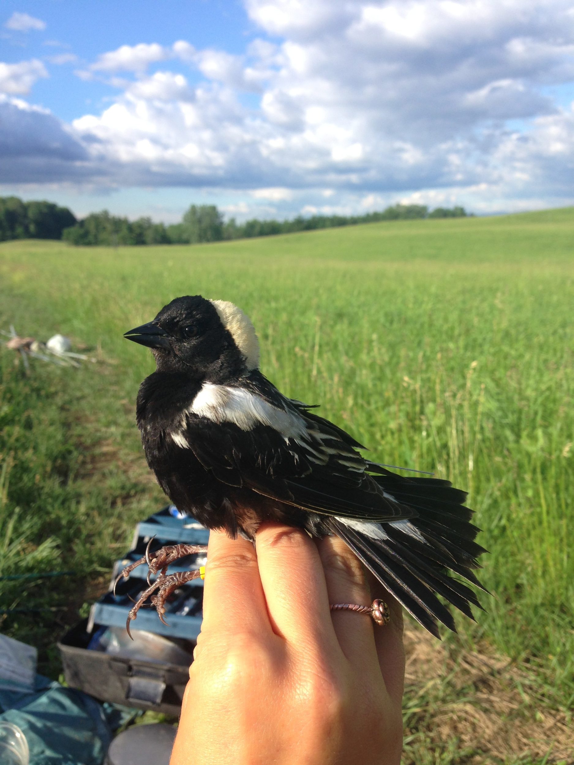 Prior to my final year at UVM, I spent the summer as a field technician with The Bobolink Project in Shelburne, VT. My first job in the field of ornithology had me mist-netting, nest-monitoring, re-sighting, and banding two common grassland bird species—Bobolinks and Savannah Sparrows. Having the opportunity to monitor and band birds allowed me to get to know individual birds and nests throughout Shelburne Farms, and seeing the data recovered from geolocator backpacks attached to some of these birds made me truly appreciate the great lengths they go to in order to raise a successful brood and return to the same fields the following year. Learning about the delicate balance in the Champlain Valley between nesting Bobolinks and farmers’ haying schedules inspired me to write my Honors College thesis on the dispersal response to disturbance of Bobolinks.