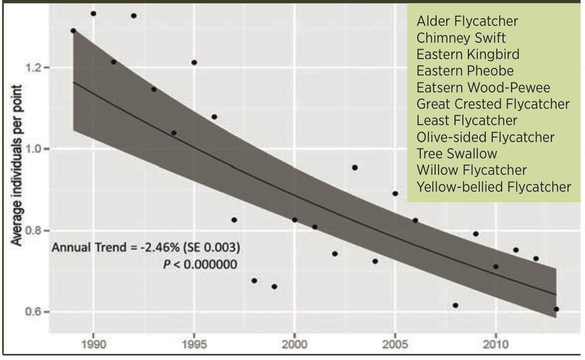 As a group, aerial insectivores (the 11 species listed in the box) have declined by 45% on FBMP surveys, corroborating an alarming trend in North America.