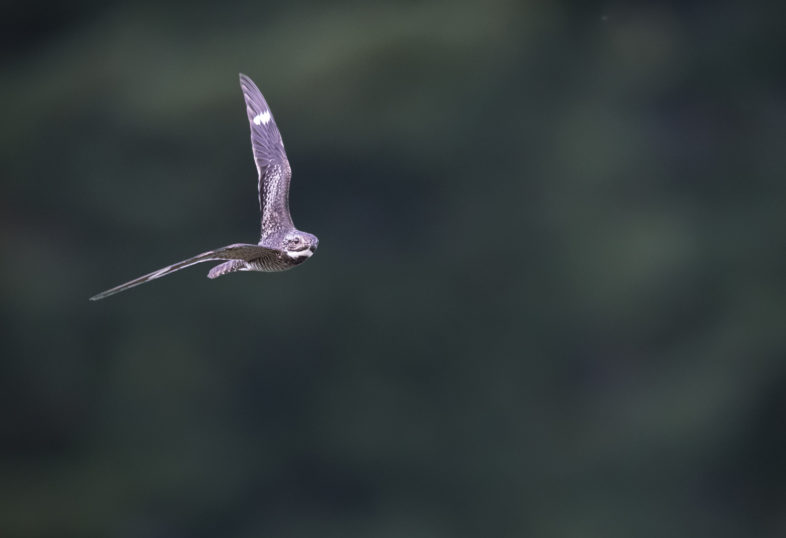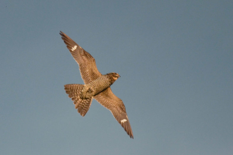 A nighthawk’s long wings show distinctive, flashing white patches as migrants hawk flying insects in the low light of late summer evenings. © Tig Tillinghast