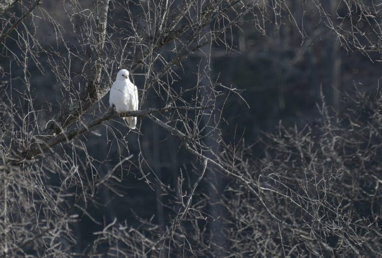 From a distance, you might think that the large white bird of prey is a Snowy Owl, its pure white feathers standing out against a background of dark branches. But a closer look reveals its smaller head and dark eyes, marking it as not an owl, but some other bird of prey. Without its characteristic red tail feathers and dappled brown and white feathers, you might not guess that it’s actually a Red-tailed Hawk. The reason for the snowy appearance of this individual is leucism. Leucism is a genetic condition in which some or all parts of an animal’s skin, hair, or in this case, feathers, lack cells capable of producing pigment. It’s different from albinism in that albino individuals generally have red eyes, while leucistic individuals usually have the eye color typical of their species. Leucism can sometimes make birds more difficult to identify, lacking their typical feathers and coloring. You might remember that last December, the winner of the VAL Photo-observation of the Month was a leucistic Black-capped Chickadee. Looking at the overall shape, structure, and behavior of birds with leucism helps with identifying the species.