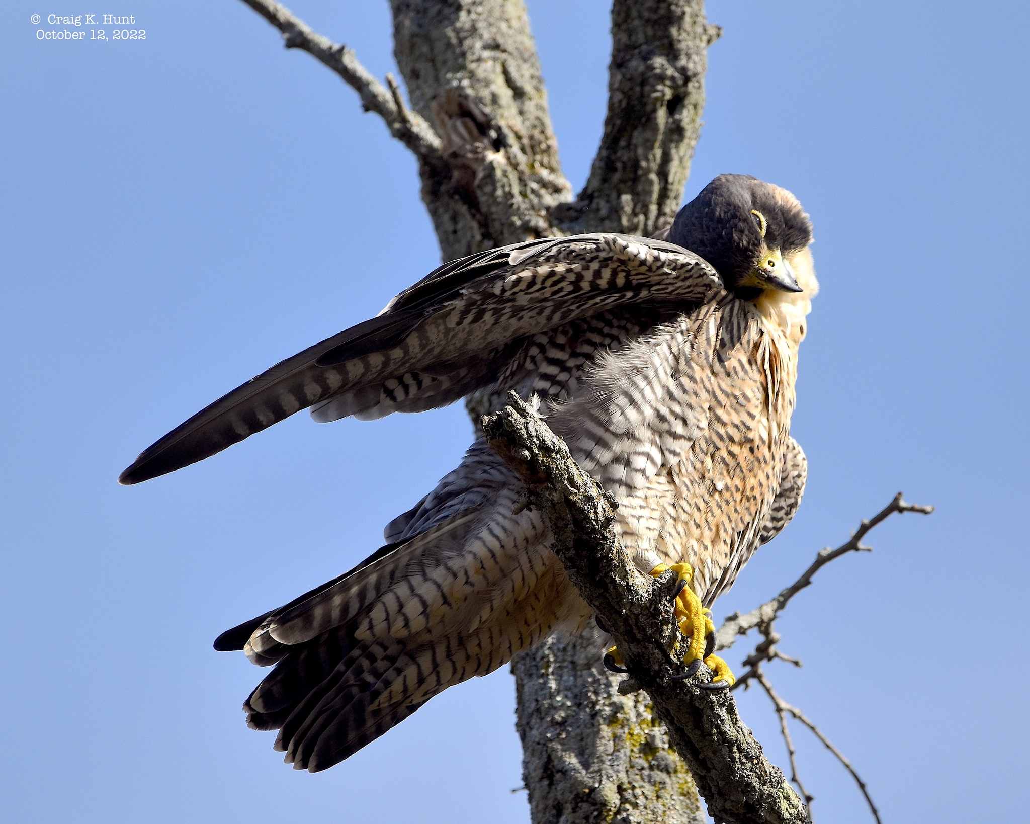 A Peregrine Falcon stretches and preens, can you spot the metal numbered band on her leg? © Craig Hunt