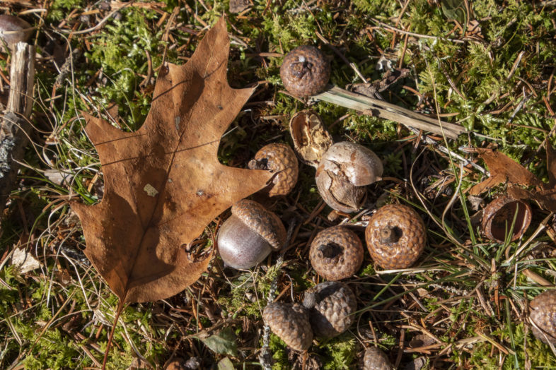 Northern Red Oak acorns are bountiful in many places this year. These were laying on the ground all around us in the forest as jays called back and forth likely collecting and caching them away. / © K.P. McFarland