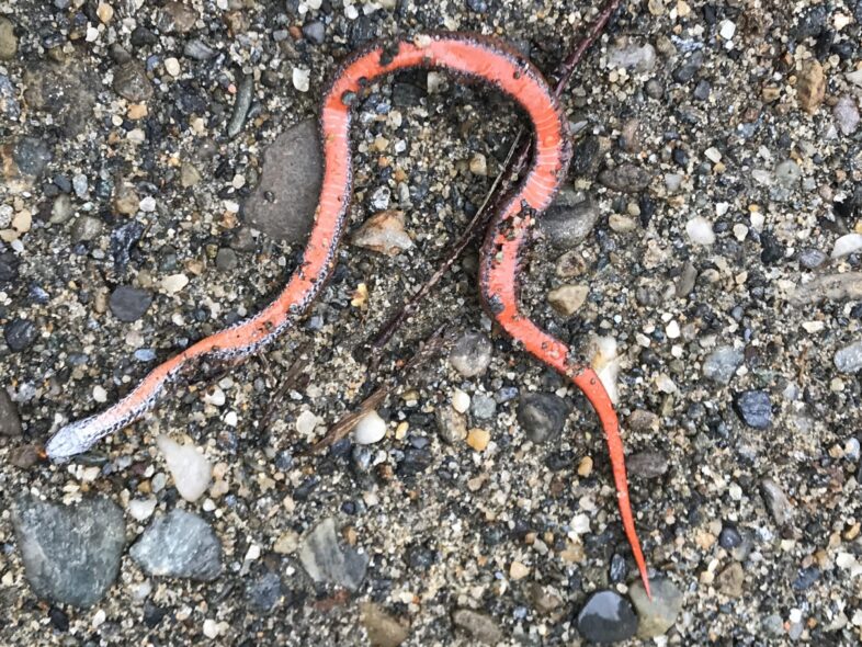 Roadkill photos, like this one of a Red-bellied Snake, can be posted to iNaturalist to help discover the “pinch points” where wildlife crosses our roadways. Click on the image to see this observation out on the WildPaths iNaturalist project.