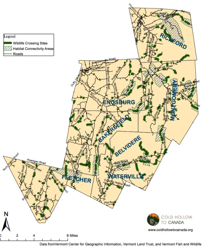 Map of potential wildlife crossing areas in the Cold Hollow region. Click on the map to visit Cold Hollow to Canada and learn more.