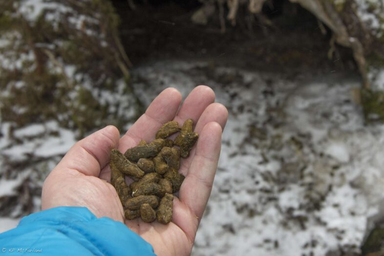 Scat was piled several feet deep at the den entrance and inside. Since the resident mostly eats woody material, it breaks apart like sawdust. /© K.P. McFarland