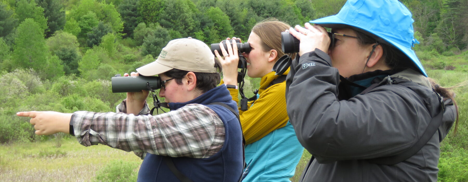 Kent, Sara, and Steve stand beside a Sugar Maple tree near the den that the porcupine stripped for food.