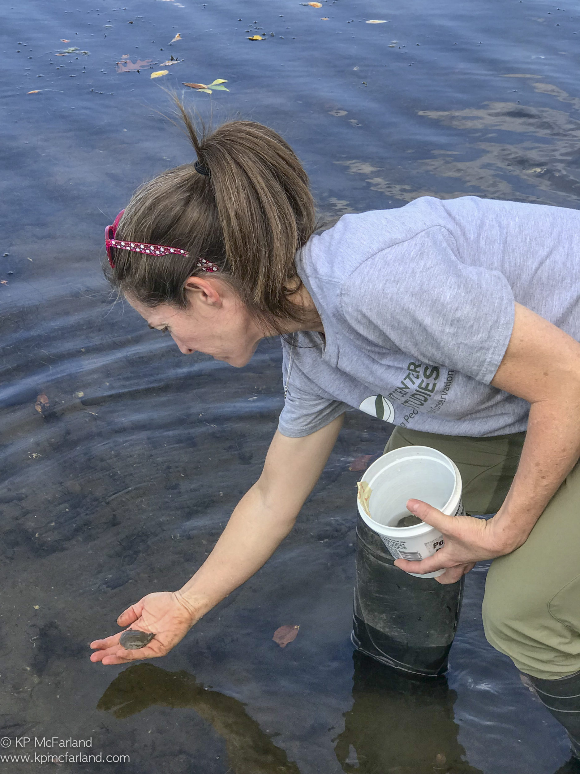 Sara examines a tiny hatchling Map Turtle that will soon be released into the lake. / © K.P. McFarland