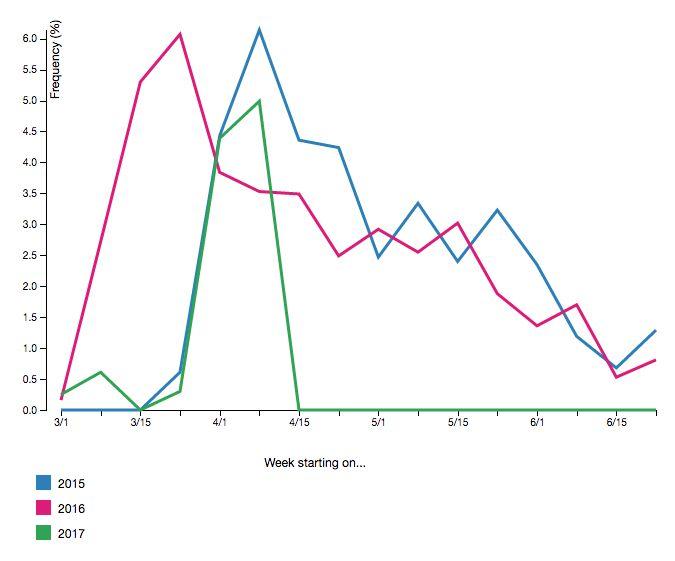 This phenology from Vermont eBird shows that with a warm spring in 2016, observations peaked on March 22. They didn’t peak until April 8 during the cold spring of 2015, similar to this year.