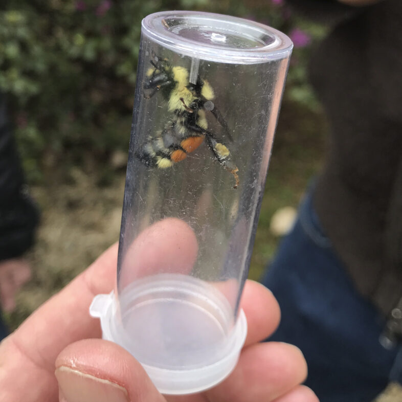 A queen Tri-colored Bumble Bee we captured and released. Note the pollen on her hind leg. The leg has a special “pollen basket”, an area of her leg that is concave with hairs arching over it to hold the pollen loaf in place. / © K.P. McFarland
