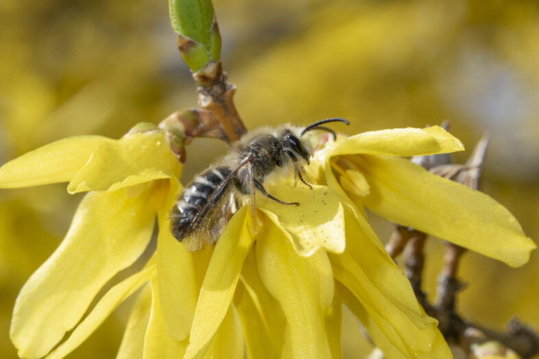 Unequal Cellophane Bee (Colletes inaequalis) visiting flowers in the garden. / © K.P. McFarland