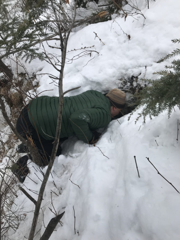 Steve Faccio examines a bank hole. What was likely once a beaver lodge is now occupied by a porcupine!