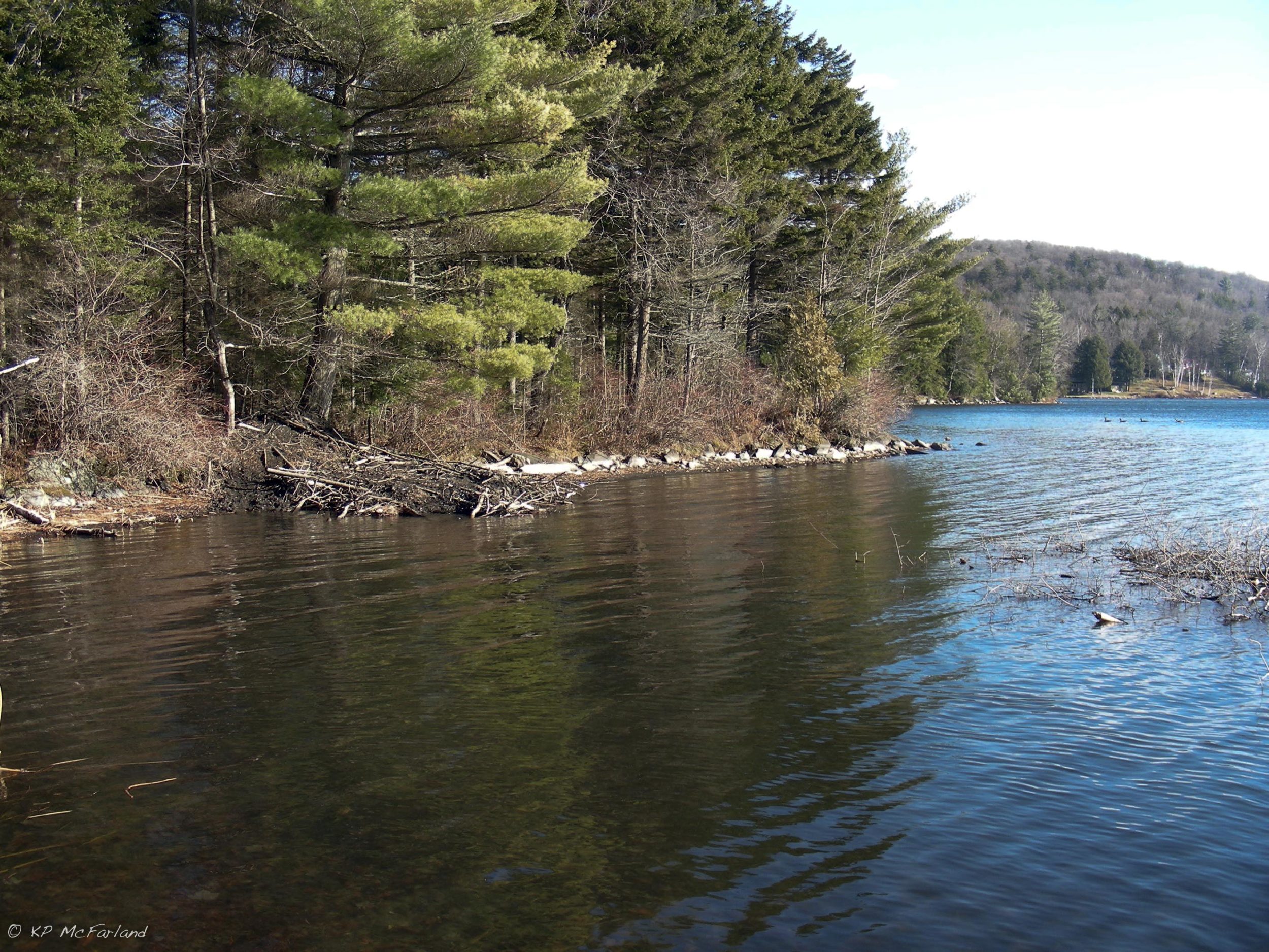 Beaver lodge in late fall with a winter cache of food sticking just out of the water in front of it. Ready for winter! / © K.P. McFarland
