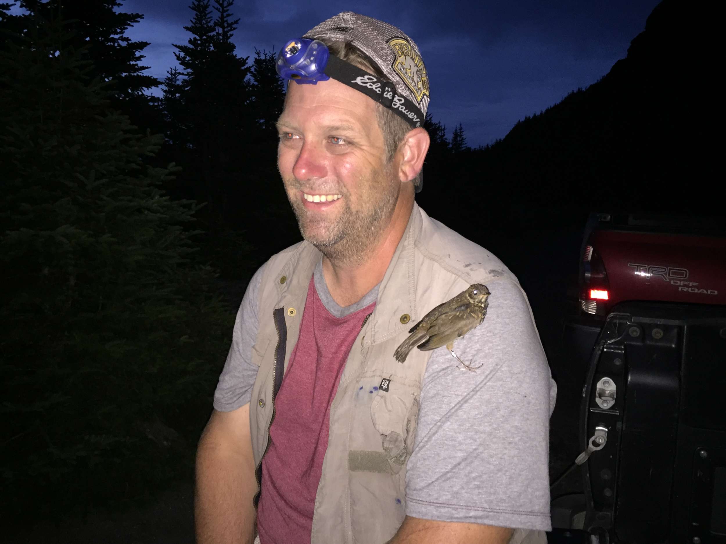 Brendan Collins with a juvenile banded Bicknell’s Thrush reluctant to liberate itself, pre-dawn on Mt. Mansfield, 28 July 2016. © Carla Skinder