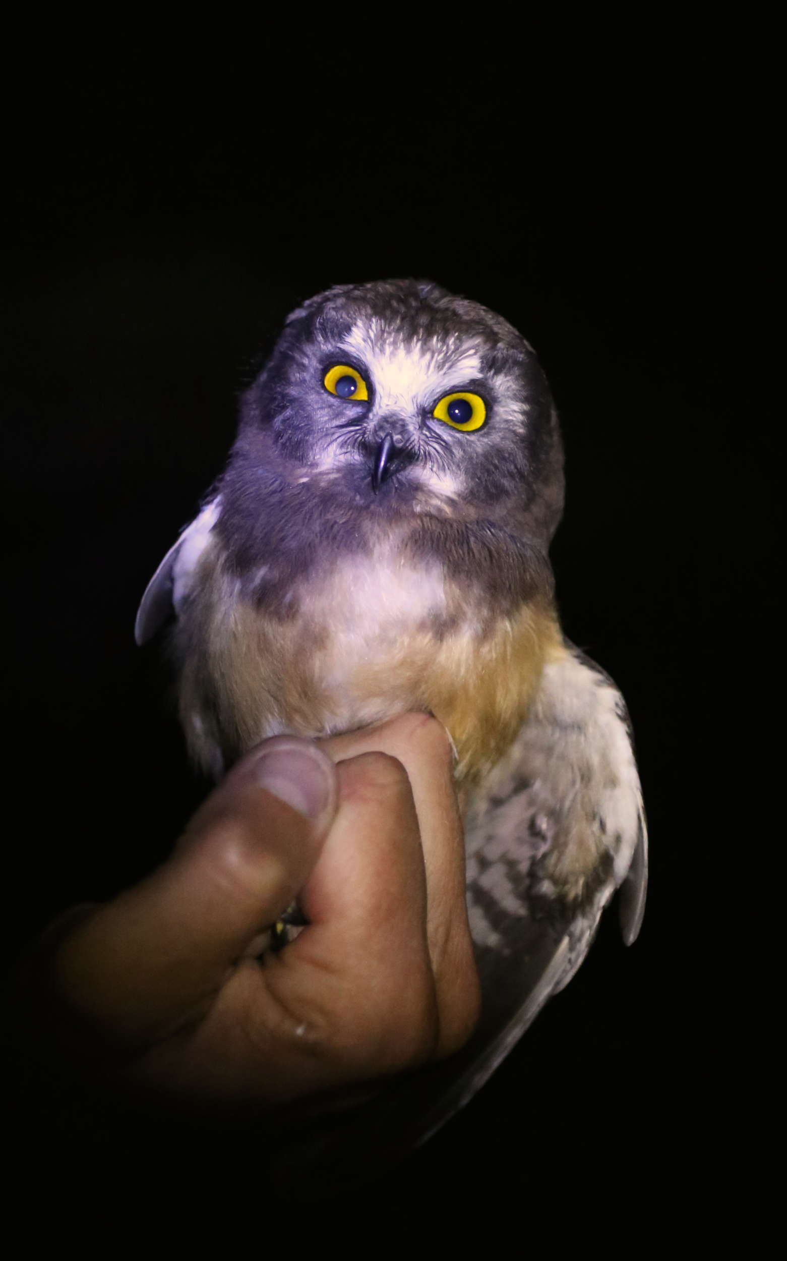 Juvenile Northern Saw-whet Owl mist-netted and banded on Mt. Mansfield, 27 July 2016. © Carla Skinder