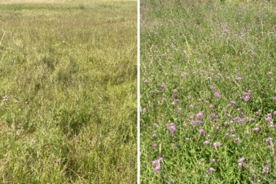 Left: hayfield vegetation. Right: the same field inundated by Spotted Knapweed (Centaurea stoebe) © Kevin Tolan