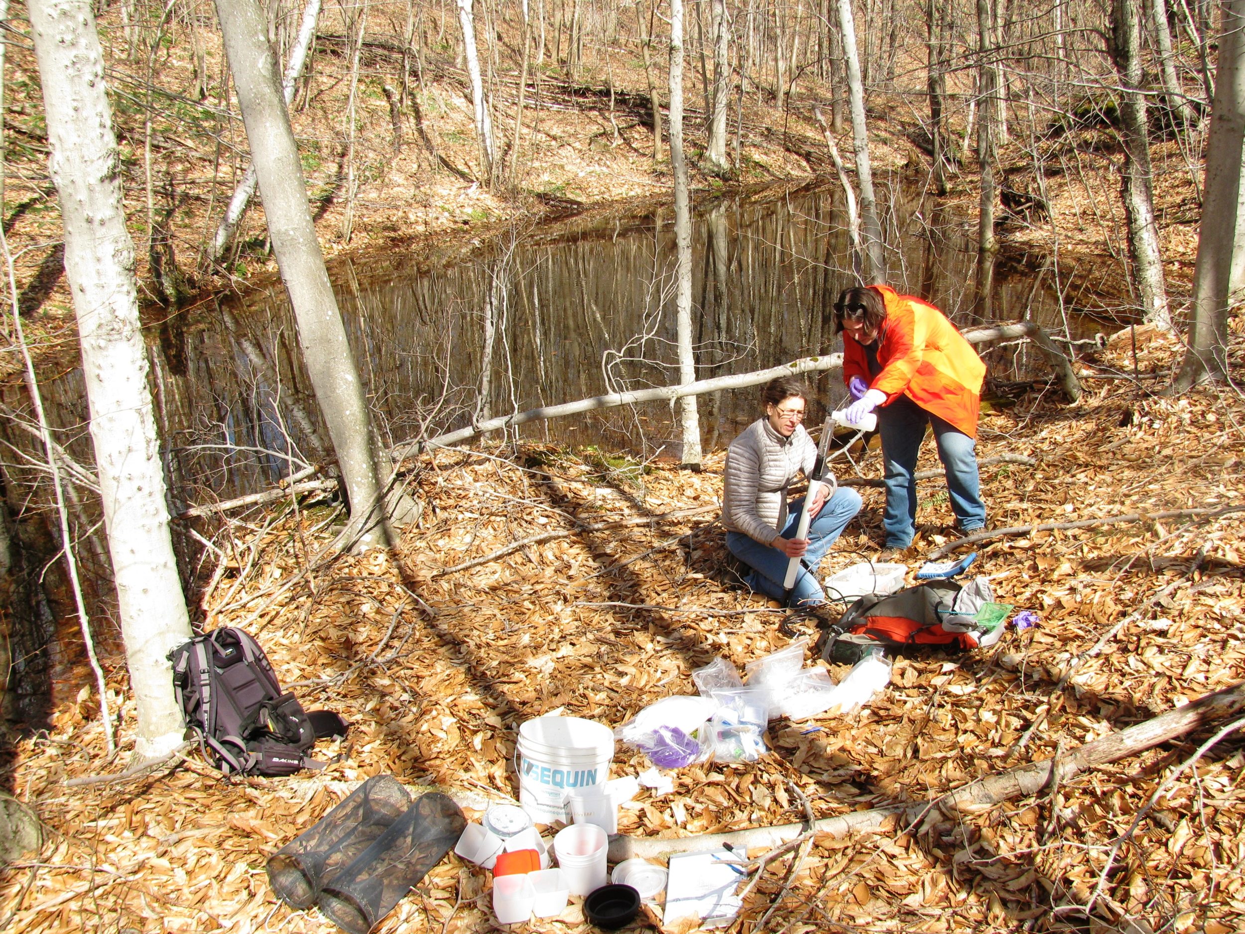 To determine MeHg concentrations in amphibians, we intensively studied six vernal pools in the Upper Valley area of Vermont, collecting samples of Wood Frog and Spotted Salamander eggs and larvae, as well as blood and tissue samples from adults of both species. In addition, we collected monthly water, soil, and leaf litter samples for Hg analysis.