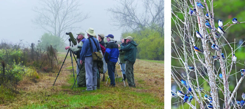 Left: Birders peer through October mist; Right: Swallows perch in a tree. Both were taken at Lake Runnemede. © Cynthia Crawford, see more photos on her website and Flickr