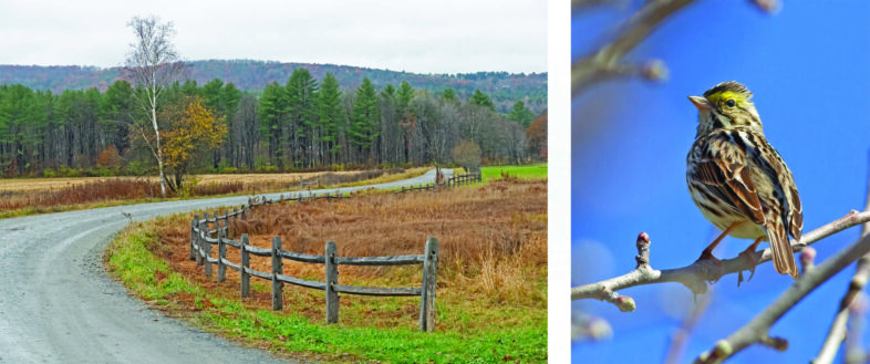 Left: Autumn road in Campbell Flats; Right: Savannah Sparrow photographed at Campbell Flats. © Cynthia Crawford, see more photos on her website and Flickr