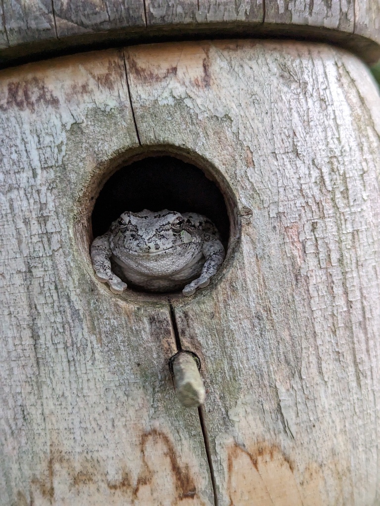 Not the usual avian inhabitant one would expect to find in a nest box, this Gray Treefrog seems to have found a cozy shelter to hide out and survey the area. © Joshua Phillips
