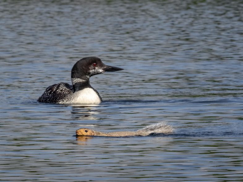 A Common Loon appears to look slightly puzzled as a gray squirrel swims by on Tewksbury Pond in Grafton, NH on 14 September 2018, Photo courtesy of Marc Beerman http://www.oldmanphotography.com/.