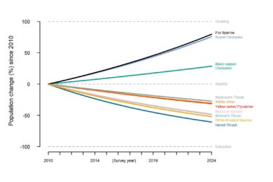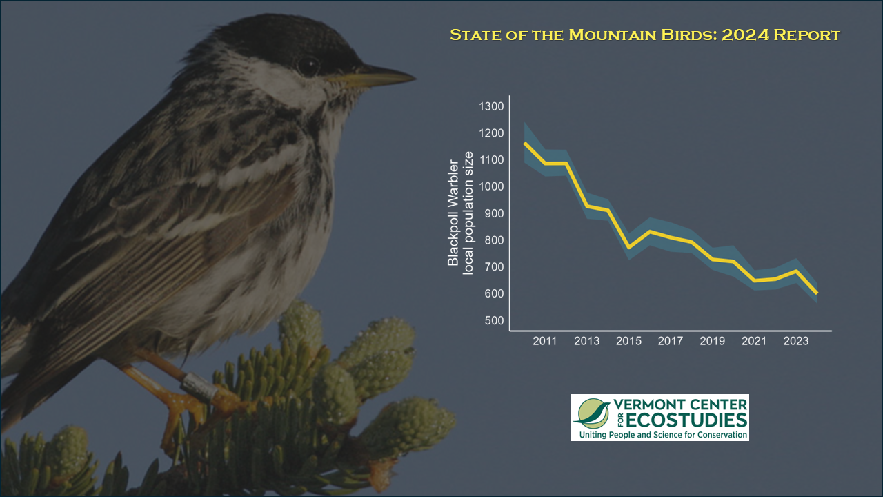 The 2024 State of the Mountains report documents continued persistent declines for our monitored spruce-fir specialists in the Northeast, including Yellow-bellied Flycatcher, Bicknell’s Thrush, Blackpoll Warbler, and White-throated Sparrow. Mountain Birdwatch data suggest that these species have declined by an average of 45% since the 2010 season. At this current rate, these declines could collectively exceed 80% by as early as 2048. Let’s hope we can identify conservation actions before then to halt or reverse these trends.
