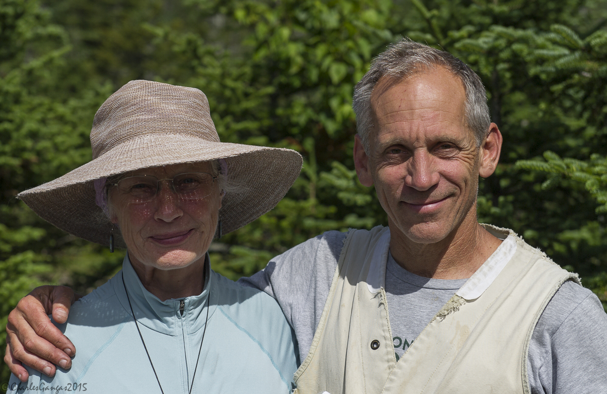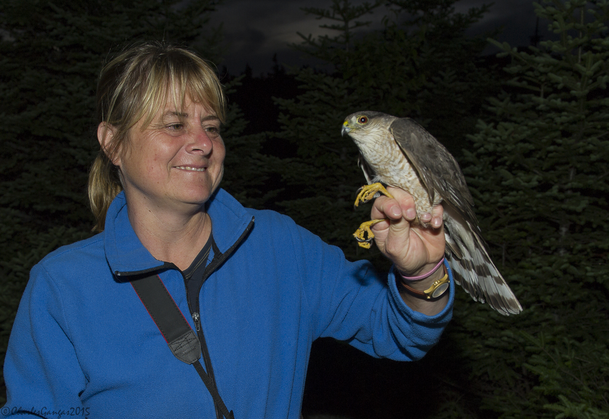 Jenn Megyesi and mist-netted female Sharp-shinned Hawk, Mt. Mansfield, 20 July 2015. Photo courtesy of Chuck Gangas.