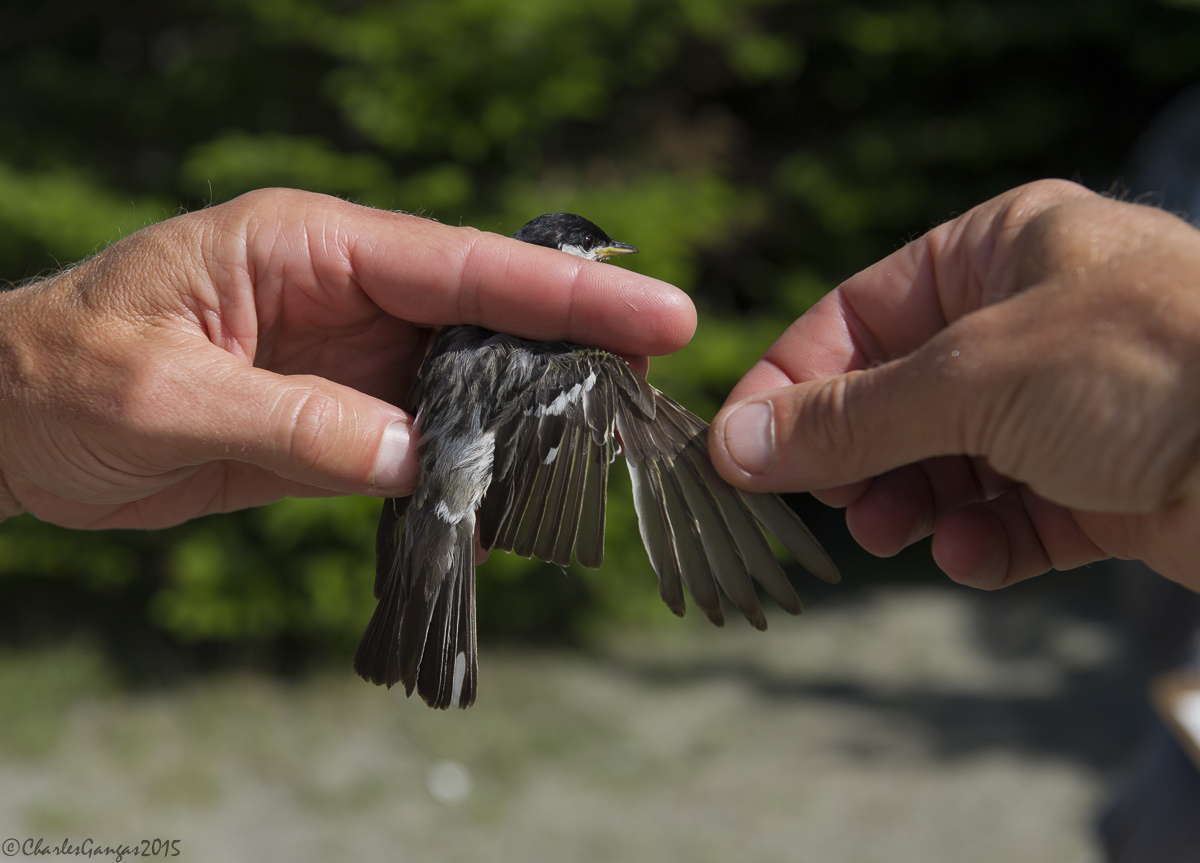 VCE’s July 20-21 Mt. Mansfield banding session capped another productive field season, our 24th studying the ridgeline’s breeding bird community. After several weeks that brought record rainfall to the mountain, our final evening there was reminiscent of our first visit on June 3 — placid and balmy, with an arresting sunset. We had 23 mist nets open by 7 pm in ideal dry, calm conditions. By the time we closed up shop at dusk, our 9 captures included 4 Bicknell’s Thrushes (BITH), one the season’s first bob-tailed juvenile, another a returning 2014 male that had so far eluded us this year. The evening show-stopper was an adult female Sharp-shinned Hawk, netted in the fading light as she presumably sought a late-day meal.