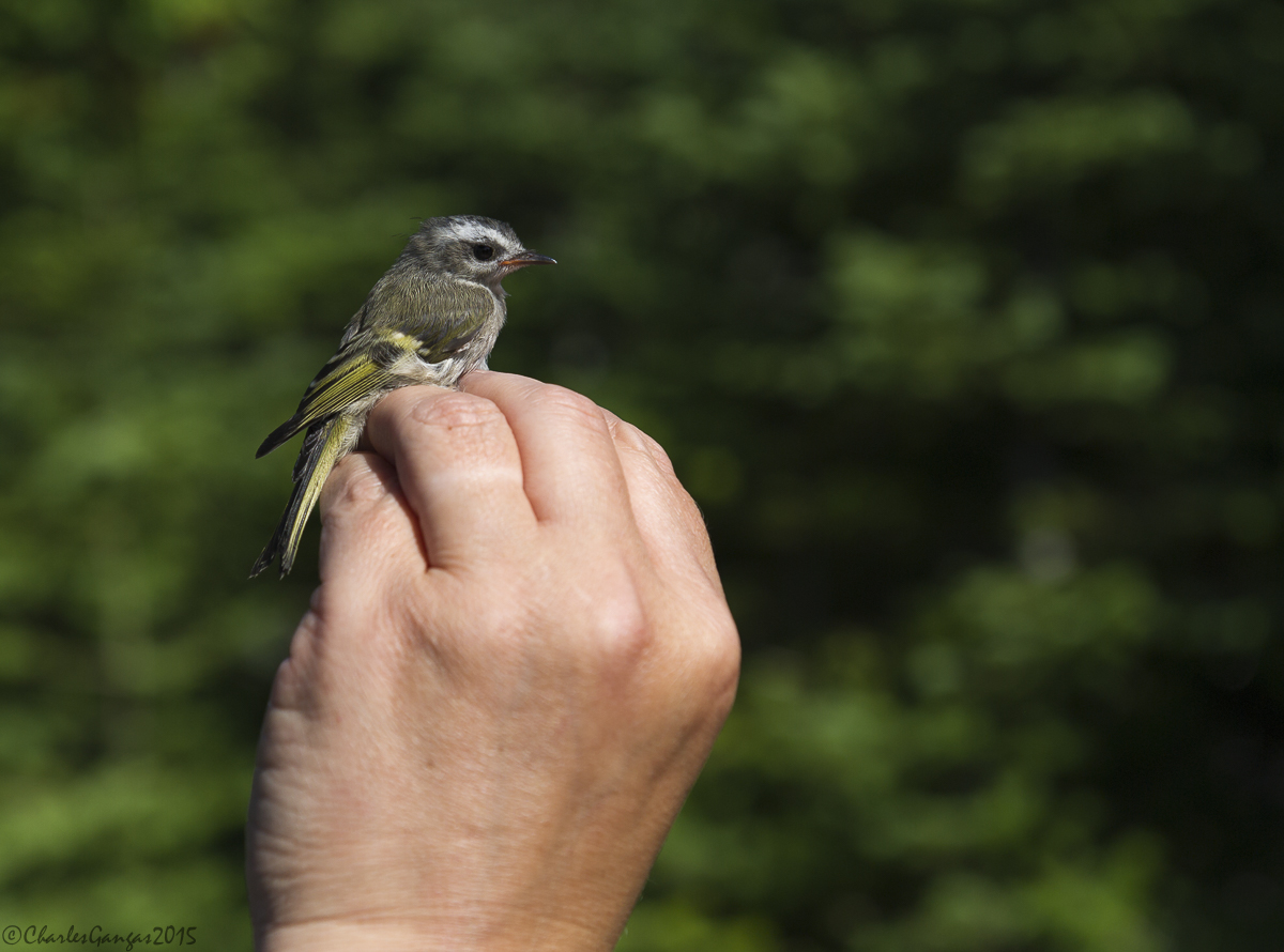 Dawn brought continued calm and fairly warm weather, as we opened our nets by 4:30 am. Netting was steady all morning, and kids ruled the day: half (24) of the 49 birds we netted were free-flying juveniles. Surprisingly, 7 of those were Golden-crowned Kinglets, which breed in Mansfield’s coniferous forests at lower elevations, but not on the ridgeline. These tiny bundles of energy are almost too small to handle, weighing in at a mere 6 grams or less! We caught several recently-fledged Blackpoll and Yellow-rumped warblers, as well as juncos and white-throats. As always in mid-July, non-local post-breeders and dispersing juveniles are beginning to show up — this week’s wanderers included a Downy Woodpecker, Hermit Thrush, Blackburnian and Black-throated Blue warbler. And, another sign that the nesting season is wound down, we captured several adult birds in early to mid stages of flight feather molt.