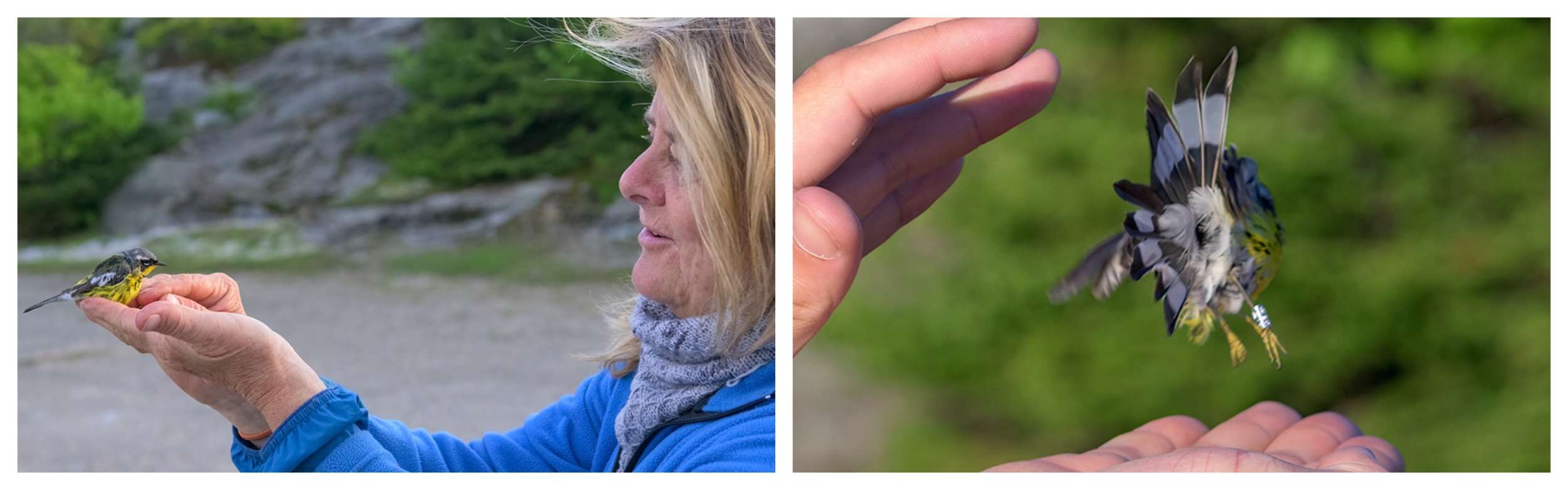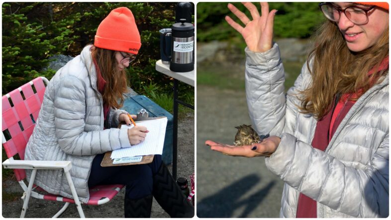 VCE’s champion all-time Mansfield data recorder Dory Hindinger exercising her immaculate penmanship (left) and releasing a banded female Purple Finch (right). © Michael Sargent (left), Charles Gangas (right)