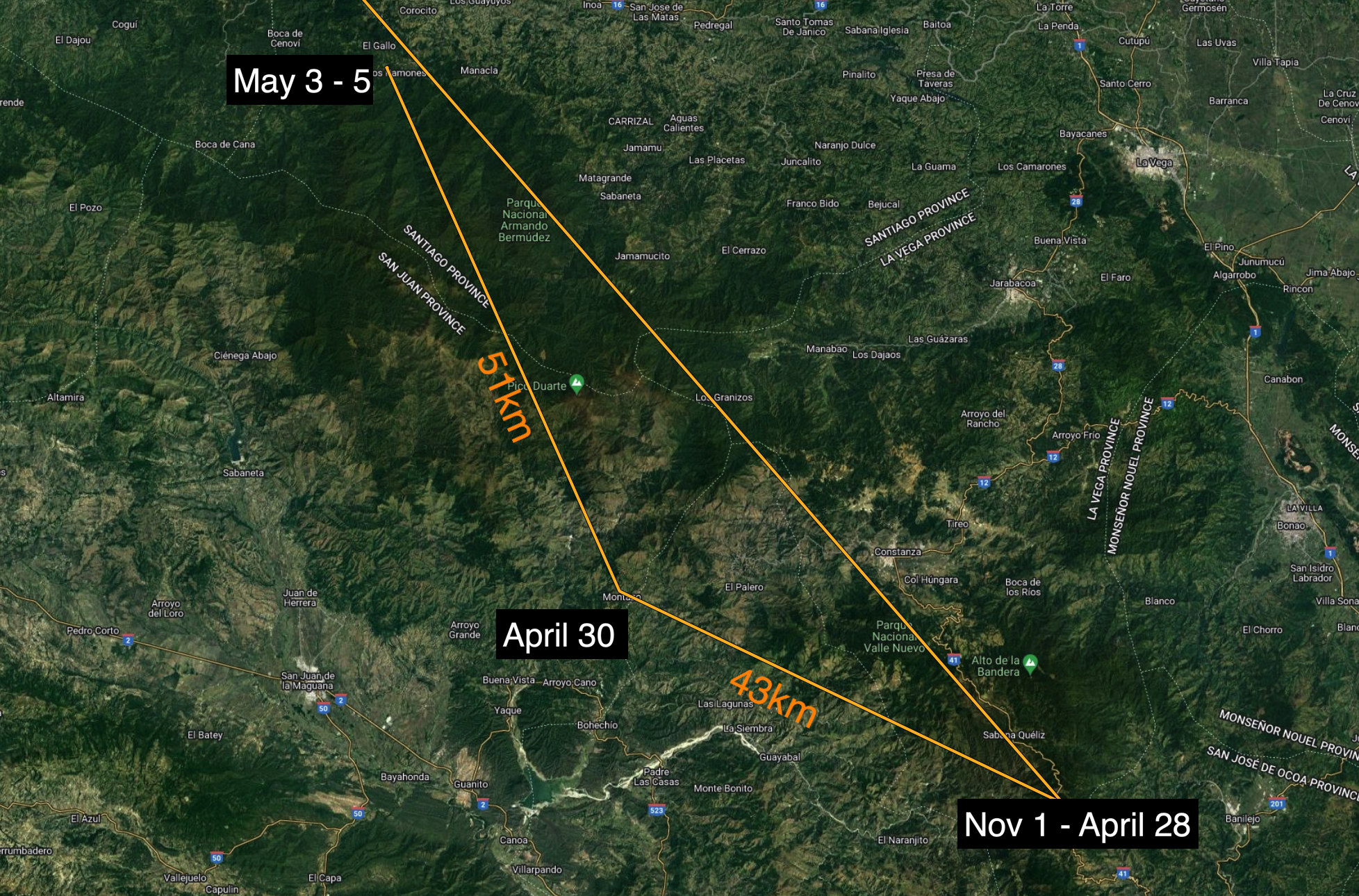 One Mansfield bird recovered this week showed some intriguing late-season dispersal, moving 43 km northwest on April 28-29 from a cloud forest site in Parque Nacional Valle Nuevo, and another 51 km only 2-3 days later to a high-elevation forest patch in Parque Nacional Armando Bermudez, where its GPS battery died. Given the late dates, it’s tempting to speculate that these were pre-migratory movements towards a northward launching point, but we’ll never know for sure.