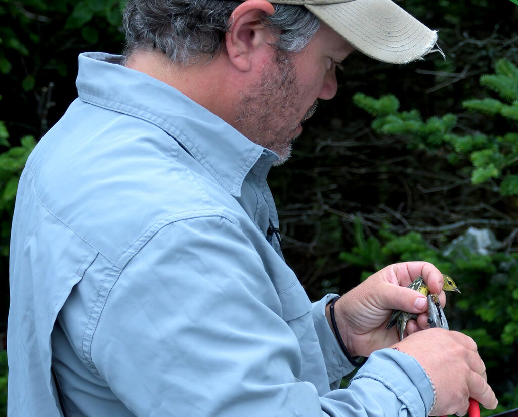 VCE biologist Mike Hallworth carefully attaches bands to a Blackpoll Warbler. This bird was banded and tagged under VCE’s USGS Bird Banding Lab permit. The Bird Banding Lab administers all U.S. bird banding and was one of the many programs that avoided deep federal funding cuts. Photo credit: Mike Sargent