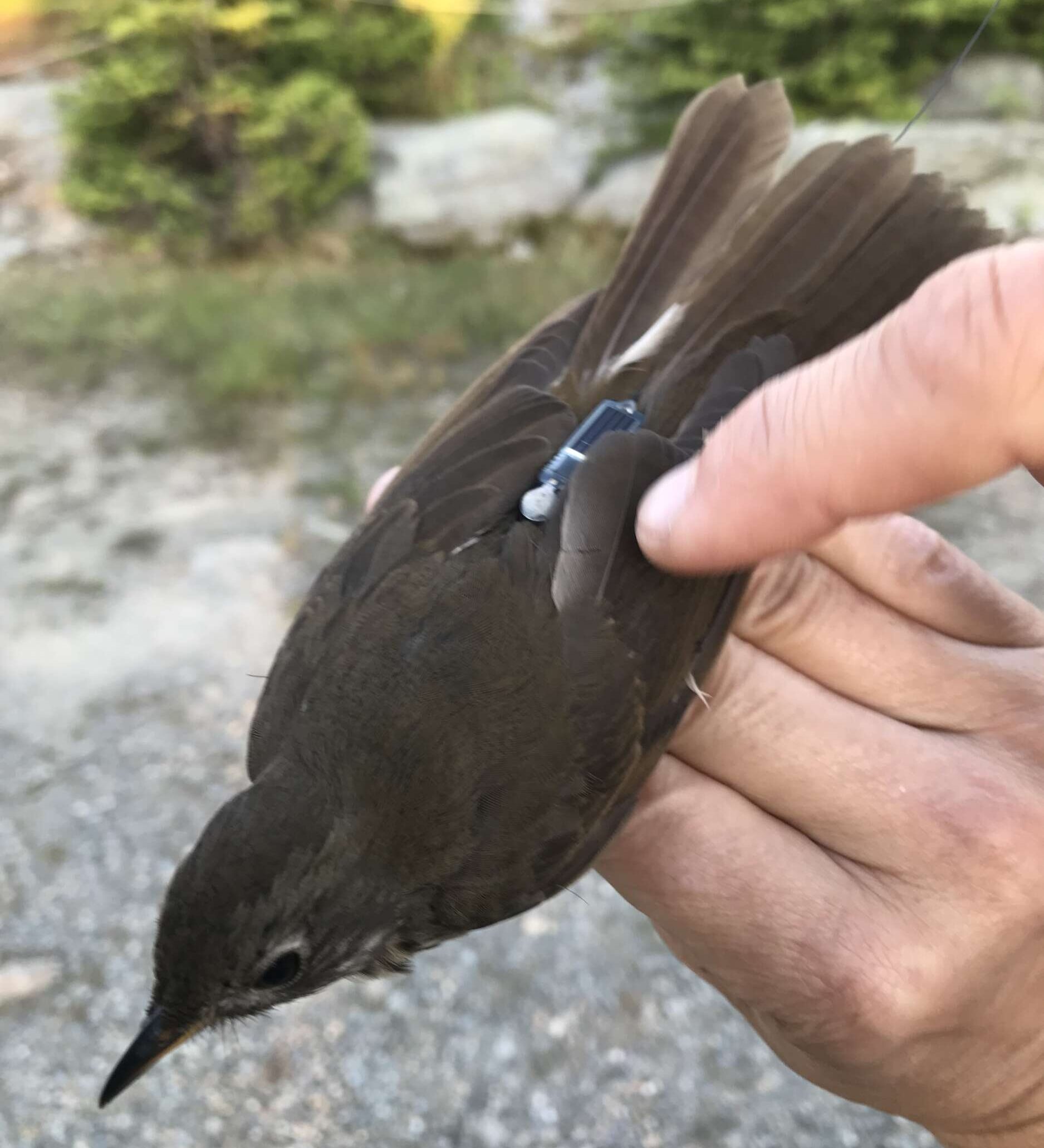 A Bicknell’s Thrush sports its new solar-powered tag.