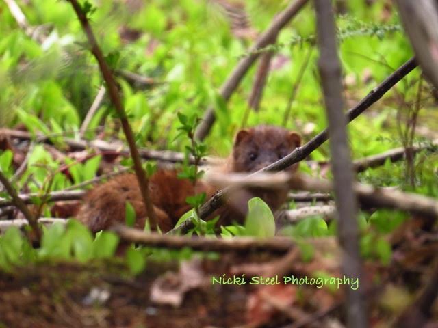 But it’s also a tough world out there to find a good and safe nest site. Nicki Steel, a new volunteer on Lake Raponda, came across the loon pair courting and/or nest searching near the 2016 nesting island. However, some geese were nearby and also looking over the island. With the expansion of the Canada Goose population, we are observing geese nests near historic loon nest sites, and we’ve even had some geese utilize the floating nesting rafts. We’ve started to place “goose guards” on the rafts to keep the geese off. Nicki was curious why the geese were hissing as she was not that close, when she caught a glimpse of movement back in the shrubs (see photo). A mink was prowling around not too far from the 2016 loon nest site and she was able to take a quick photo of it. Mink have been observed taking loon eggs on webcams.