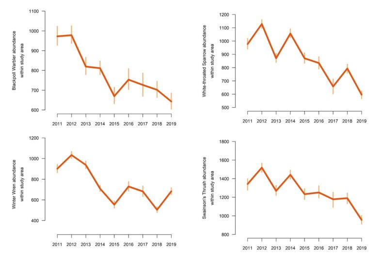 Of the 10 bird species monitored by Mountain Birdwatch citizen scientists, five have experienced steady and substantial declines from 2011 through 2019 in the northeastern United States, including Blackpoll Warbler (upper left), Winter Wren (lower left), White-throated Sparrow (upper right), and Swainson’s Thrush (lower right). Panels show the local abundance estimates (thick orange lines) of these four species each year around the ~750 Mountain Birdwatch sampling stations. Vertical orange lines present the 95% Bayesian credible interval – a measure of uncertainty surrounding the annual population estimates.