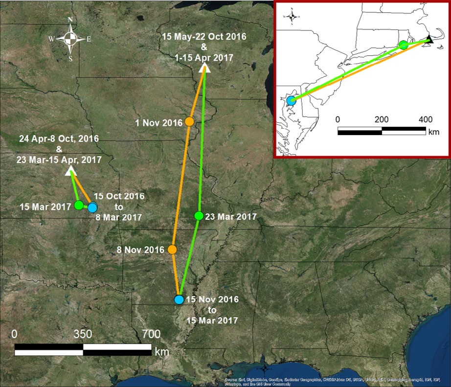 GPS tag locations (circles) during fall (orange) and spring (green) migration, and the nonbreeding period (blue) from Eastern Meadowlarks originally tagged at Department of Defense installations (triangles) in Kansas and Wisconsin (main panel), and Massachusetts (inset). Colored lines represent probable and approximate flight paths between consecutive (~1–2 weeks apart) locations. Not shown are two meadowlarks tagged in Maryland that were non‐migratory year‐round residents.